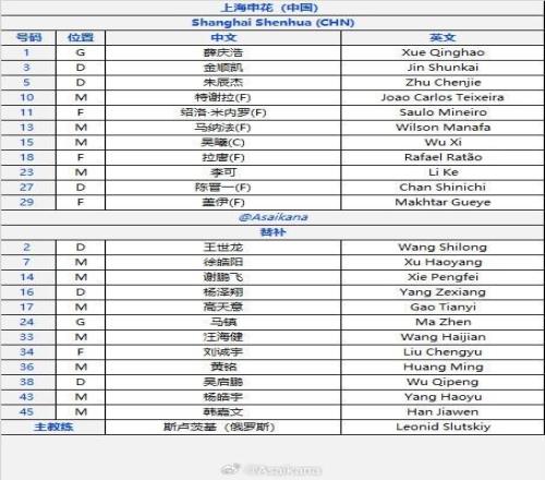 北京时间2月17日20:15,亚冠精英联赛阶段第8轮,上海申花客战武里南联。赛前首发公布。