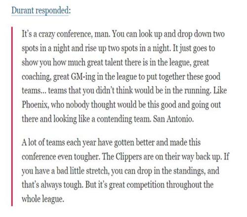 杜兰特对西部格局的评价却值得一看,杜兰特说道:西部真的很疯狂,也有可能一夜之间排名上升或下降两位,西部存在联盟多位顶级球员/教练/GM,他们都组建了优秀的球队。原本觉得不是争冠球队的太阳、马刺本赛季都发挥出色。每年都有球队进步让这个联盟竞争更激烈,快船都在复苏,西部会非常之激烈。