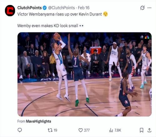 在全明星正赛中,杜兰特防守文班亚马时,文班亚马面对KD干拔后仰中投命中,美媒Clutchpoints写道:跟文班亚马比起来KD看起来都小一圈。