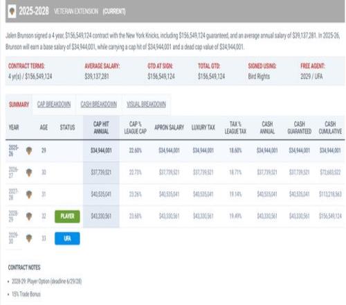 布伦森希望在2028年夏成为自由球员时公正的对待他下一份合同,因为他主动接受了大幅度降薪来帮助尼克斯组建布伦森、布里奇斯、阿奴诺比、唐斯的核心阵容。