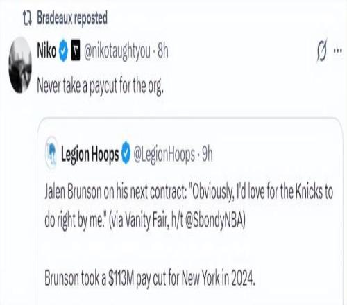 美记Niko评价布伦森的言论:永远不要为了这些球队组织选择降薪。(他暗示布伦森被尼克斯坑惨了)