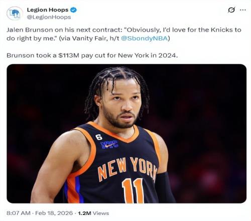 北京时间2月18日,根据美媒Sbondy NBA的消息,尼克斯球星杰伦-布伦森谈到了关于下一份合同的看法,他说道:显然,我希望尼克斯能善待我。此前布伦森在2024年夏跟尼克斯提前续约四年1.565亿,他降薪额度达到1.13亿美元。