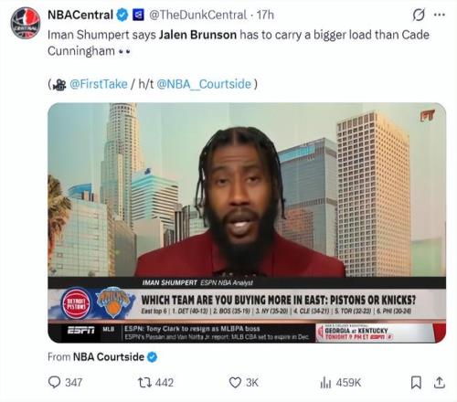 前NBA球员伊曼-香波特评价布伦森与坎宁安两个东部顶级控卫,他表示布伦森所在环境比坎宁安难很多,布伦森要承担的压力远远超过坎宁安。