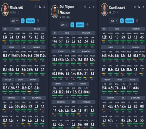 通过DPM值,不难发现,这五位球员就是如今联盟里的最强的5位个体。五人中,SGA代表的是极致的进攻,他进攻的O-DPM值高达5.7,而文班亚马则代表极致的防守,他的D-DPM值高达2.8,是五人中唯一一位比代表进攻贡献值O-DPM值还高的一位。莱昂纳德是五人中最为均衡的,他的O-DPM值为4.6,D-DPM值为1.3,是五人中两项数据差值最小的一位。