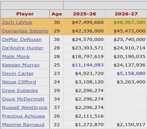小萨博尼斯的合同是4年1.86亿美元,2028年夏天才能到期。本赛季小萨因伤只打了19场比赛,其中15场首发。场均出战29.7分钟,得到15.8分11.4篮板4.1助攻0.9抢断2.7失误,三项命中率:54.3%,18.5%,72.7%。