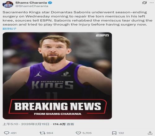 北京时间2月19日上午,NBA名记Shams报道,萨克拉门托国王队内线多曼塔斯-萨博尼斯接受左膝半月板撕裂修复手术,本赛季报销!小萨本赛季一直接受半月板撕裂的康复治疗,并尝试带伤出战,但最终他还是选择了手术。
