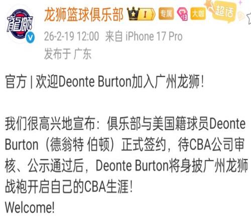进入窗口期之后,更换外援成为CBA球队的工作重点,本赛季成绩不错的广州男篮也裁掉了第一阶段的大外援托马斯,他们官方宣布和曾经在NBA打球的伯顿完成了签约,但广州龙狮应该还会补充外援,毕竟现在的三名外援都是外线。