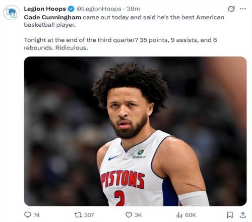 坎宁安三节打完已经35+9+6,美媒LH写道:坎宁安今天刚刚站出来说自己是美国最强的球员就打出这样的表现。
