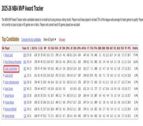 坎宁安目前的MVP概率只有1.9%排在第三,约基奇77.4%第一,亚历山大16.6%第二。