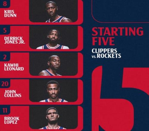 首发阵容方面,湖人队这边,全员健康,雷迪克教练排出的首发五人组为:马库斯-斯马特、勒布朗-詹姆斯、德安德烈-艾顿、奥斯汀-里夫斯、卢卡-东契奇;快船这边,比尔(左臀骨折)赛季报销、新援加兰(右脚扭伤)归期未定、博格丹诺维奇也因伤缺阵,首发阵容则为:科怀-伦纳德、约翰-科林斯、布鲁克-洛佩斯、德里克-琼斯、克里斯-邓恩。