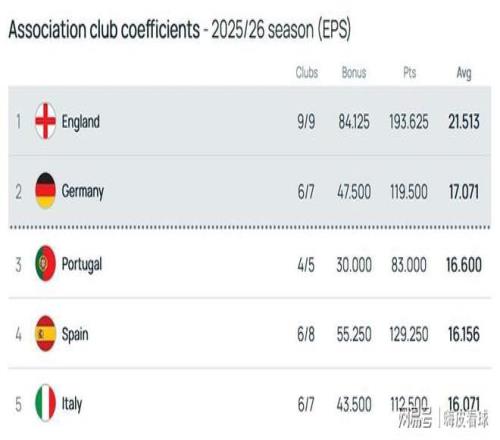欧足联公布了最新的积分榜,英超以21.513分排在第一,领先第二名的德甲超过4分。葡超、西甲和意甲分别排在第三到第五名,除了英超之外,前5名的积分差距不到1分,竞争相当激烈。第6名的波兰只有14.125分,第7名的法甲只有14.035分,落后比较多,基本上没有机会进入前两名。