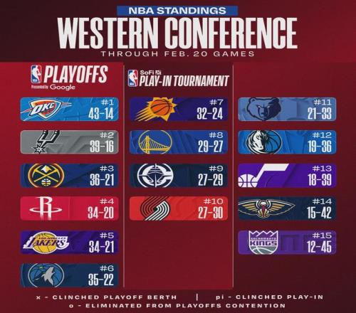 掘金36胜21负重返西部第3,领先火箭0.5个胜场。开拓者27胜30负仍居西部第10,依然落后快船0.5个胜场。开拓者核心阿夫迪亚赛后表示:“掘金昨天输了,今天他们想证明一些东西。这就是NBA运作方式,没什么大惊小怪的。”