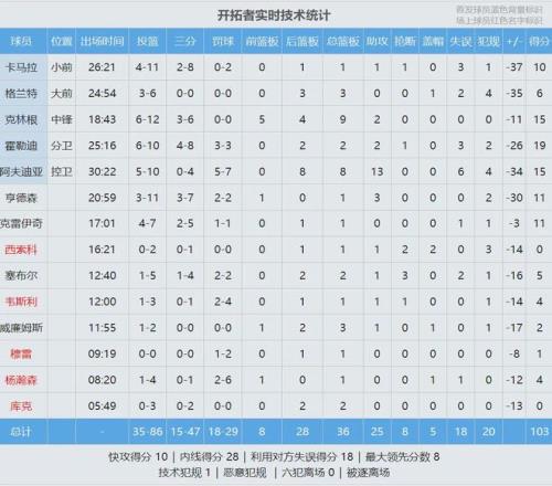 此役阿夫迪亚投篮10中5,三分4中0,罚球7中5,得到15分8篮板13助攻6失误,正负值-30。约基奇打了29分钟,投篮15中10,三分4中3,罚球11中9,狂砍32分9篮板7助攻4抢断,正负值+40。其中正负值追平约老师生涯纪录!