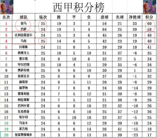 积分榜方面,皇马先赛输球,暂时还是2分优势力压巴萨领跑,只不过他们今天这一爆冷输球给巴萨反超机会,极可能让他们来个榜首一轮游,本轮巴萨只要拿下3分,就能1分优势超过皇马夺回榜首。此前3轮只拿到1分的马竞今天终于止住颓势,暂时追上比利亚雷亚尔,差榜首的皇马12分还是排在第4。