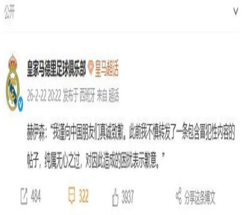 即使是皇马官博发布的道歉内容,其实也没有太大的诚意,赫伊森转发辱华内容的社媒如果是首次转发内容的话,需要进行二次确认,只有这样才能转发成功,也就是说他转发的内容是得到了本人确认的。其次,赫伊森的转发内容评论他还进行了点赞,就算是误触进行了转发,总不能同样“巧合”的进行了点赞吧。最后,转发内容在他的社媒出现的时间超过了3周,这么长时间都没有发现也并不合理。