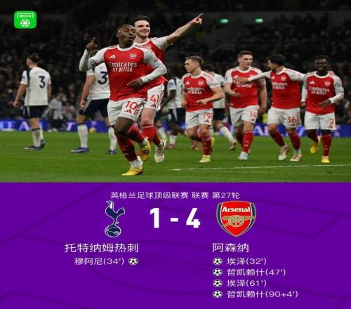 北京时间2月23日0:30,英超第27轮迎来北伦敦德比,托特纳姆热刺坐镇主场迎战阿森纳,本场主裁判为彼得-班克斯。上半场,埃泽凌空斩首开记录,紧接着穆阿尼抓住赖斯失误破门闪电扳平。下半场,哲凯赖什远射破门,穆阿尼进球被吹,埃泽再下一城梅开二度;补时阶段,哲凯赖什再入一球也双响。最终,阿森纳4-1联赛双杀热刺。
