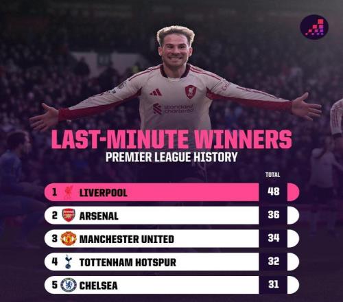 英超第27轮,利物浦客场1-0击败诺丁汉森林,麦卡利斯特在比赛第97分钟攻入绝杀进球,据统计,利物浦队史英超在第90分钟及以后已打入48粒制胜球,比其他任何球队至少多了12球(阿森纳36球)。