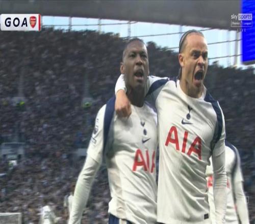 英超第27轮,热刺主场对阵阿森纳,上半场穆阿尼破门为热刺扳平比分,斩获英超生涯处子球。
