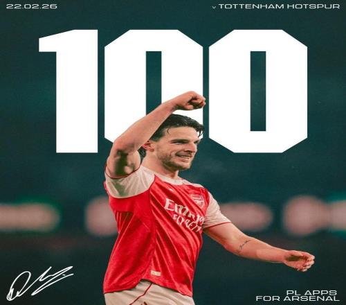 英超第27轮,阿森纳客场对阵热刺,赖斯首发出战,迎来枪手生涯第100次英超出场的里程碑之战。