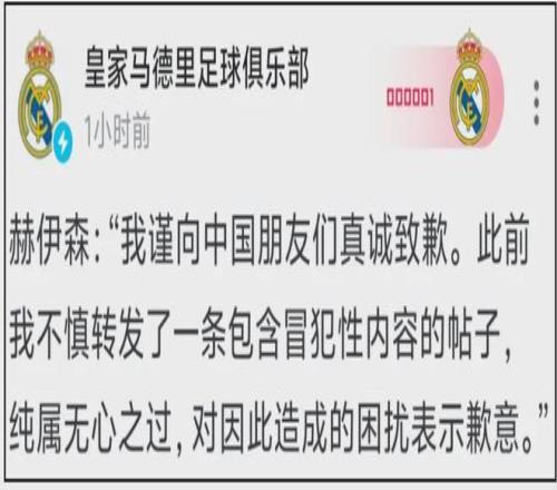 赫伊森:“我谨向中国朋友们真诚致歉。此前我不慎转发了一条包含冒犯性内容的帖子,纯属无心之过,对因此造成的困扰表示歉意。”