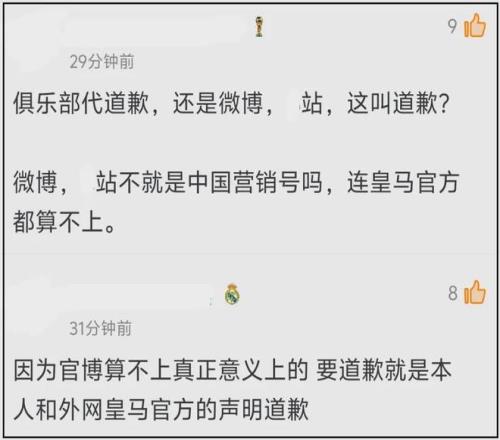 目前,皇家马德里足球俱乐部账号分别在微博和某站发布了道歉动态,内容如下: