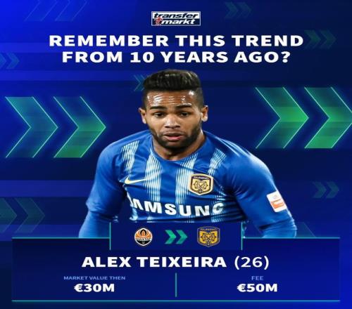 特谢拉(顿涅茨克矿工→江苏苏宁(已解散) 身价3000万欧 转会费5000万欧)