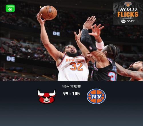 第四节公牛塞克斯顿拿下8分,尼克斯唐斯拿下11分,最终公牛99-105不敌尼克斯