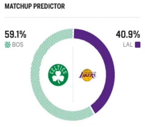 赛前,美媒ESPN对本场比赛进行了胜率预测,湖人队胜率仅有40.9%, 凯尔特人胜率则高达59.1% ,差距还是很明显的。