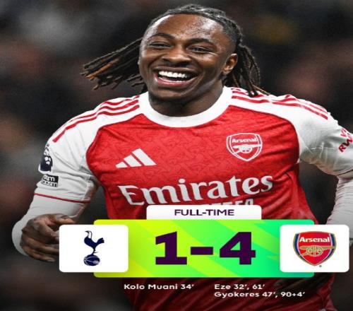 热刺随后的反扑屡屡受挫,甚至错失了扳平比分的绝佳机会。第53分钟,加拉格尔右路传中,禁区内穆阿尼推倒加布里埃尔后将球打进,但主裁判经过确认后示意进球无效,热刺的希望再度破灭。反观阿森纳,进攻势头愈发猛烈,埃泽与约克雷斯的双核配合愈发默契,萨卡则在边路持续制造威胁,不断冲击热刺的防守防线。第61分钟,阿森纳扩大领先优势:埃泽直塞给禁区内的萨卡,后者的捅射被维卡里奥挡出,跟进的埃泽反应迅速,得球后补射得手,3-1。埃泽完成梅开二度后,本赛季对阵热刺的进球数达到5粒,跻身阿森纳队史德比射手榜前列,与亨利、范佩西等传奇球星并列第三。