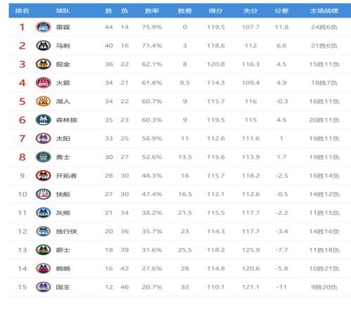 雷霆赢球后2连胜,战绩44胜14负,排名西部第一,领先第二的马刺3个胜场。