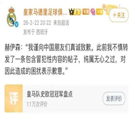 2月22日,皇家马德里足球俱乐部官方微博发布道歉声明,转述豪森的回应,称此事“纯属无心之过”。豪森表示:“我谨向中国朋友们真诚致歉。此前我不慎转发了一条包含冒犯性内容的帖子,纯属无心之过,对因此造成的困扰表示歉意。”