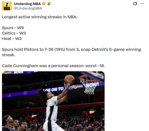马刺队9连胜不仅是联盟现存最长连胜,也是马刺队时隔7年再次拿到9连胜,上次要追溯到18-19赛季,本赛季也是马刺自18-19赛季后再次拿到至少41场胜利。