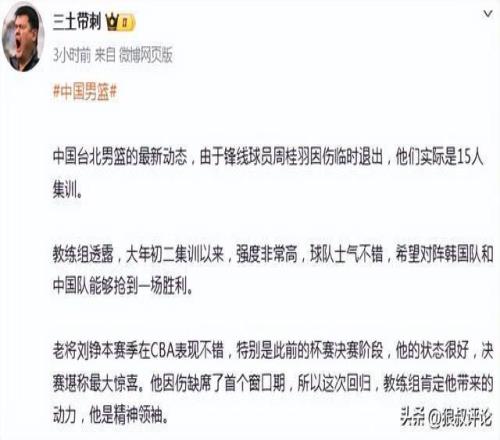 北京时间2月24日,根据中国台北媒体的报道,锋线球员周桂羽因伤临时退出,只有15人参加了集训。