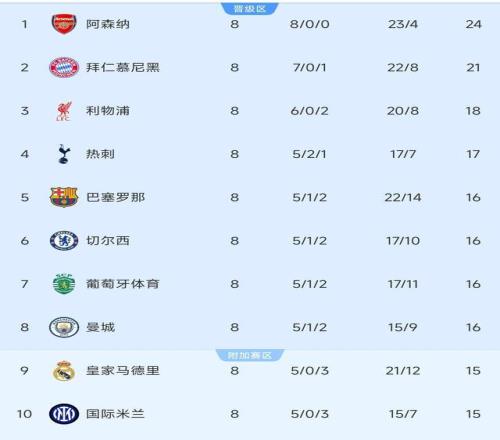 1,本赛季欧冠,率先晋级16强的八支球队中,英超成为大赢家。阿森纳、曼城、切尔西、利物浦和热刺,足足5支豪门直接挺进。英超球队展现了极强的冲击力,以及细腻程度很高的传控配合。除此以外,德甲的拜仁,西甲的巴萨,以及葡萄牙的葡萄牙体育,也直接晋级。