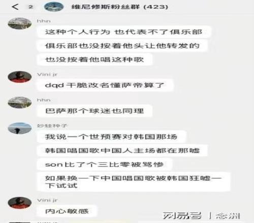据网友爆料,在国内的一个423人的维尼修斯粉丝群里面,某球迷表示:“我至今都不知道这些人叫唤什么,发个图片咋了?赫伊森说啥了?那个人不是中国人?赶紧把他开除国籍吧。”