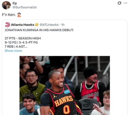 面对库明加这样的首秀表现,部分勇士球迷直接转发其表现怒喷昔日不愿意使用库明加的科尔。
