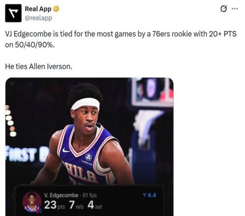 同时埃奇库姆的效率要更加出色,本场已经是其新秀赛季第3次以180俱乐部命中率(50/40/90)砍20+,成功追平艾弗森并列76人队史第一。