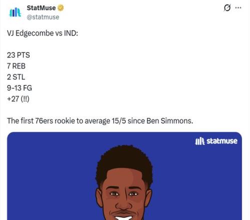 双核轰59+15+13全能数据,恩比德持续暴走梦回巅峰!超级探花埃奇库姆更该夸,高效轰23+7在场净胜27分成76人近10年来首人+队史第一助飞费城成为大黑马搅局东部。