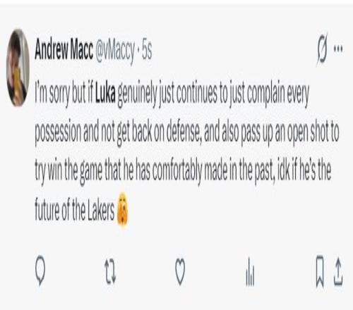 湖蜜:东契奇只是不停抱怨每一次进攻没哨,他还不及时回防,错失了一个轻松得分的机会,我真的要质疑他是否能成为湖人的未来之星了。