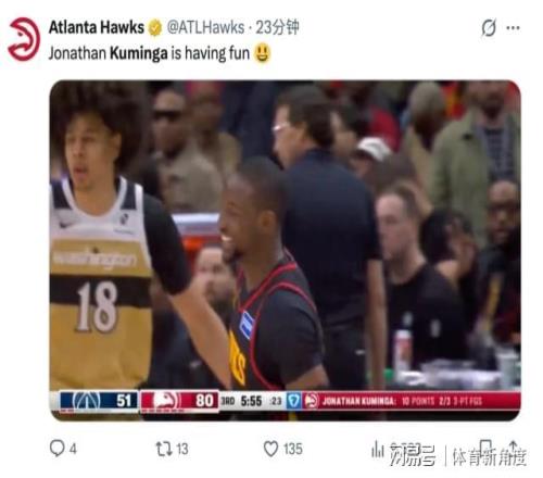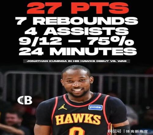 全场24分钟轰下27分7板4助2断,75%的命中率亮瞎眼!更绝的是,这孩子从第一球开始就咧着大白牙傻笑,活像中了信息的二哈勇士那会儿,库明加最高分才25分,还"你们逼我上班"的苦瓜脸。如今在老鹰,这笑容比亚特兰大的阳光还灿烂,连场边卖热狗的大叔都打趣:"这小子怕不是把快乐基因注射到篮球里了!"