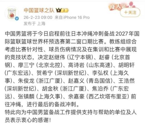 中国队教练组综合考虑比赛针对性、球员伤病情况及在集训和比赛中展现的竞技状态,决定了出征第二个窗口期的14人大名单。