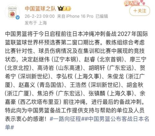 23日,中国男篮的官方微博宣布,国家队教练组综合考虑比赛针对性、球员伤病情况及在集训和比赛中展现的竞技状态,决定赵继伟(辽宁本钢)、赵睿(北京首钢)、廖三宁(北京北控)、高诗岩(山东高速)、胡明轩(广东宏远)、贺希宁(深圳新世纪)、李弘权(上海久事)、朱俊龙(浙江广厦)、赵嘉义(青岛国信)、王浩然(深圳新世纪)、胡金秋(浙江广厦)、焦泊乔(广东宏远)、张镇麟(上海久事)、余嘉豪(西乙坎塔布里亚)等球员前往冲绳,进行最后的备战。