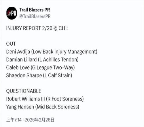 北京时间2月26日,开拓者已经召回杨瀚森,并更新了他的伤情。明日出战公牛的状态是出战成疑(50%上场可能),他的伤病被标注为背部中段酸痛。此前,前方消息是他遭遇了背部拉伤。此外,罗威因右脚酸痛也被列为出战成疑,阿夫迪亚、利拉德、乐福和夏普被列为缺阵状态。