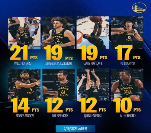 此役勇士队9人轮换有8人上双,波杰姆斯基19+8+6,穆迪14分3助攻,霍福德10分7篮板,理查德21分6助攻5篮板,桑托斯17分4助攻,波斯特12分8篮板,斯潘塞12分9助攻,佩顿19分5篮板,莱昂斯9分8篮板(差1分就完成9人全上双)。