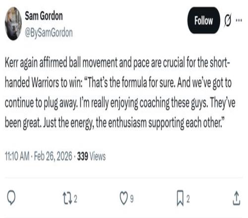 加上赛季报销的巴特勒,以及一直因伤缺席的与波神,本场比赛勇士队5大核心悉数缺阵,算上双向合同的莱昂斯才摆出9人轮转。