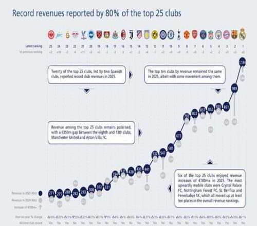 北京时间2月26日,欧足联官方发布了《2025俱乐部财务与投资格局报告》,其中列出了各俱乐部2025年度收入排行榜,其中皇马位列第一,巴萨第二,而前10当中有6家英超俱乐部。