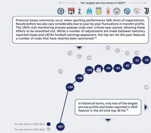 欧足联统计2025年欧洲税前亏损最高的10家俱乐部: