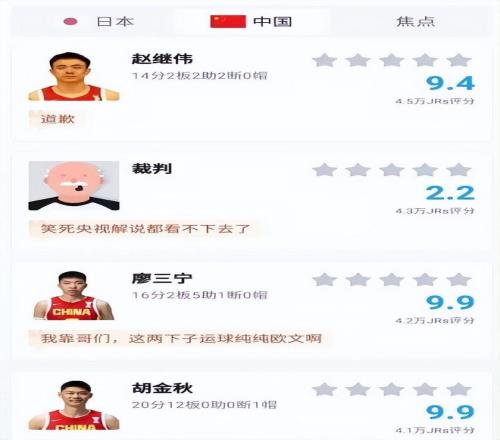 接着说一下评分比较高的球员,总共有六人的评分超过了9分,分别是胡金秋、贺西宁、廖三宁、赵继伟、朱俊龙和高诗岩。其中胡金秋、贺西宁、廖三宁的评分高达9.9分,这足以说明了他们的表现堪称完美。胡金秋进攻端和护框的稳定性、贺西宁的三分球、廖三宁的突破,都给了中国男篮很大帮助,也是球队能够逆转取胜的大功臣,这点毋庸置疑。