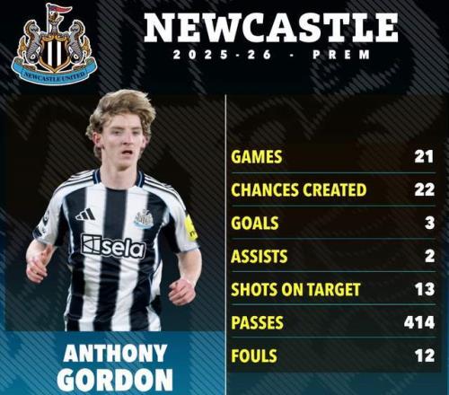 戈登身高1米83,司职左边锋,也能踢中锋。2025-26赛季,戈登在英超21场贡献3球2助,发挥起伏不定。不过在欧冠,戈登10次出场打进10球,射手榜上仅次于13球的姆巴佩。戈登也是英格兰现役国脚,代表三狮军团出场16次打进2球,有望出战2026年世界杯。