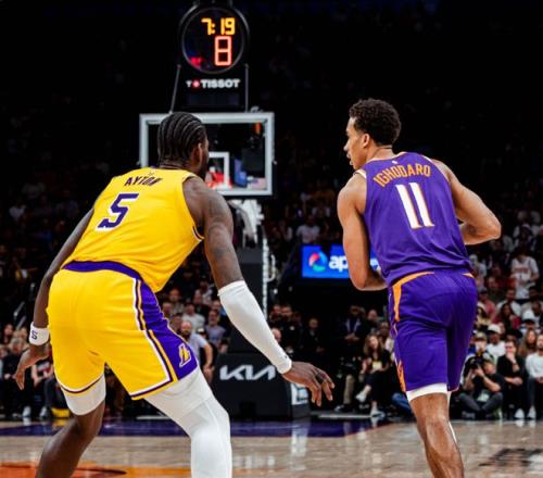 连关键时刻都不会打了。上一场惜败魔术后,队内更衣室气氛并不好,里夫斯甚至拒绝接受采访,东契奇也承认和里夫斯+詹姆斯同时在场时,需要考虑很多问题。但湖人最大的问题还是内线,艾顿已经支撑不起首发位置,相比之下,海斯成了球队内线的稳定支撑。太阳这边,布克臀部伤势至少休战到3月初;布鲁克斯遭遇骨折,至少休战到3月底,就剩杰伦格林带队。回顾一下比赛,开场奥尼尔就命中三分,东契奇跳投+里夫斯喂饼老詹,邓恩逼迫东契奇踩线失误,里夫斯被断,格林和马威继续上分。东契奇抛投止血,但湖人进攻哑火。